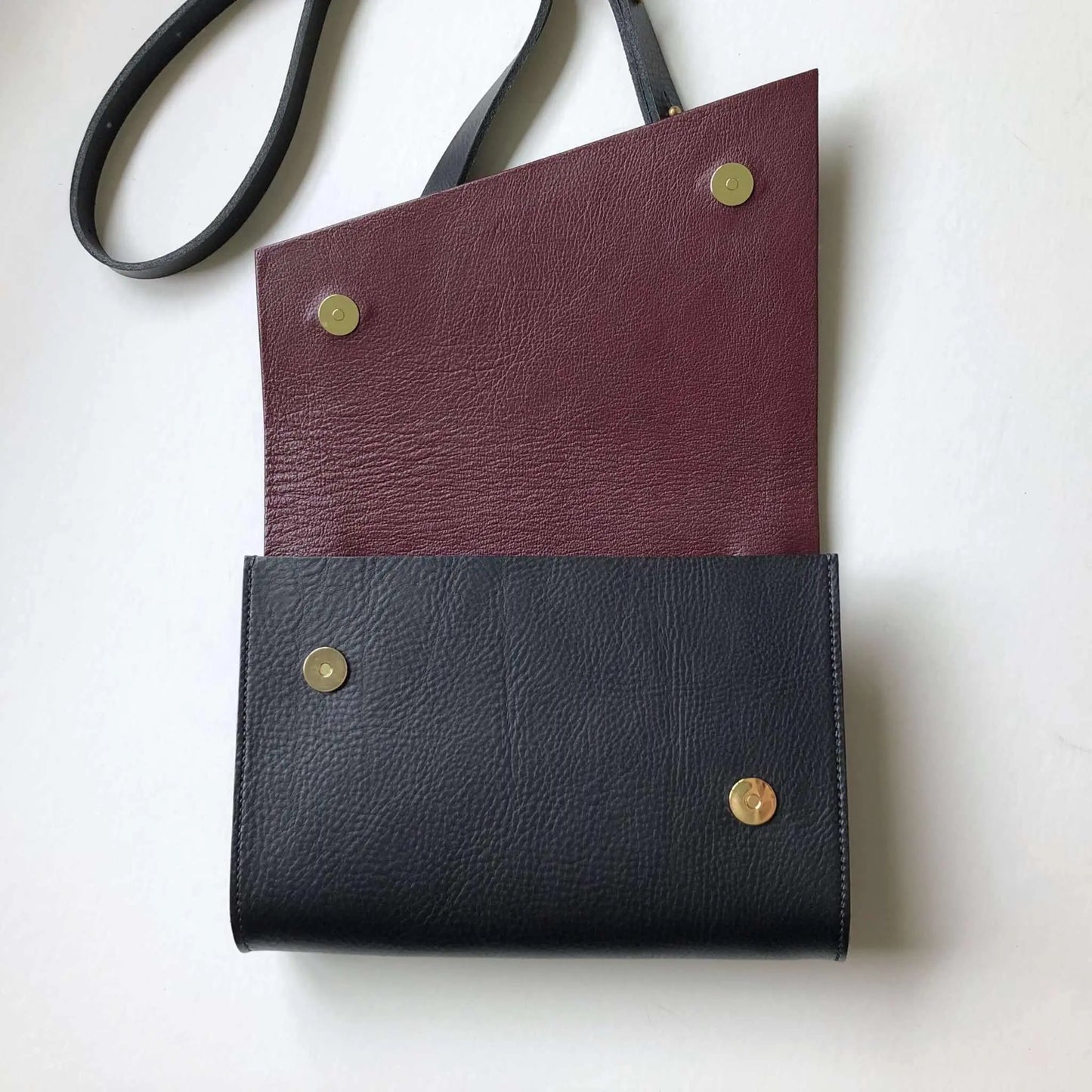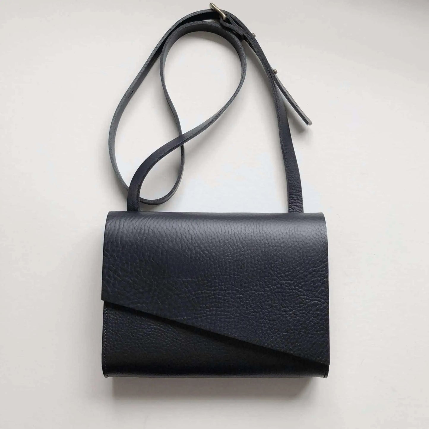 Handmade cross body leather bag in full grain black leather.