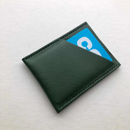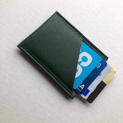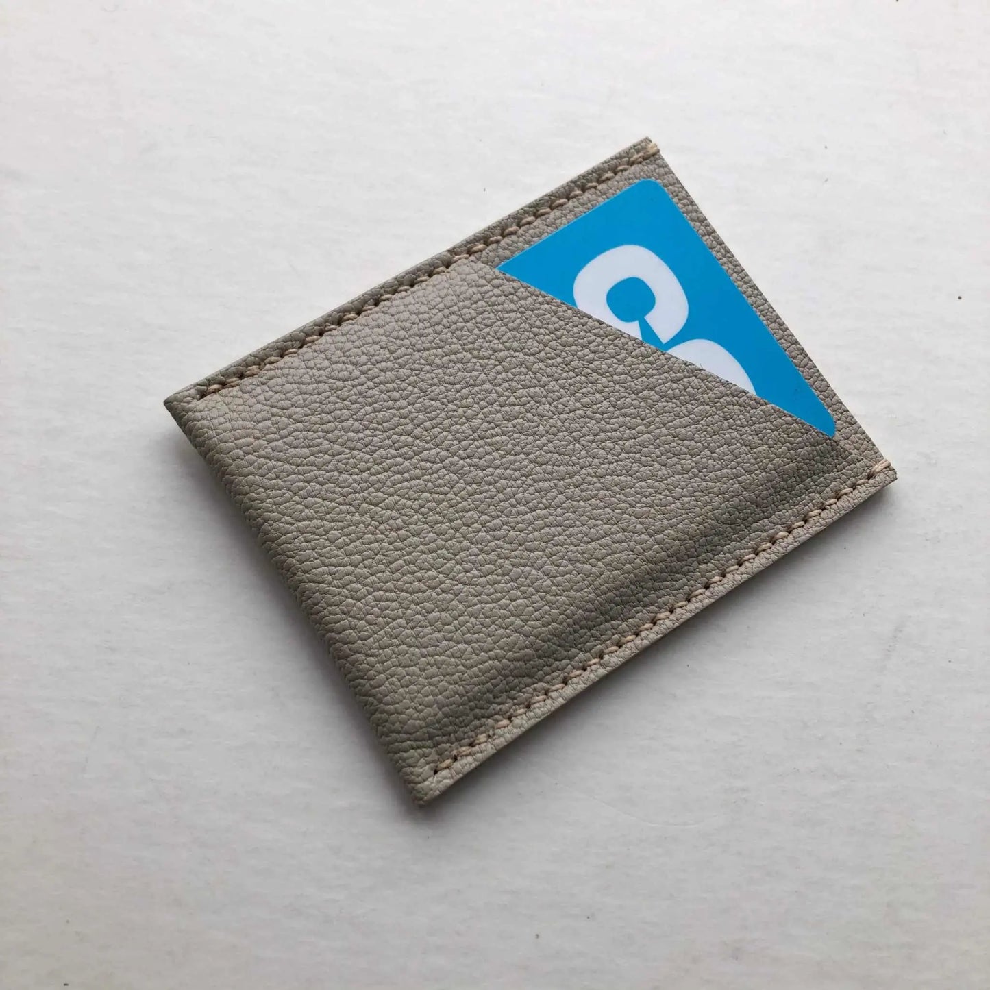 Leather card holder available in green or taupe grey raised grain ‘pebble’ leather.