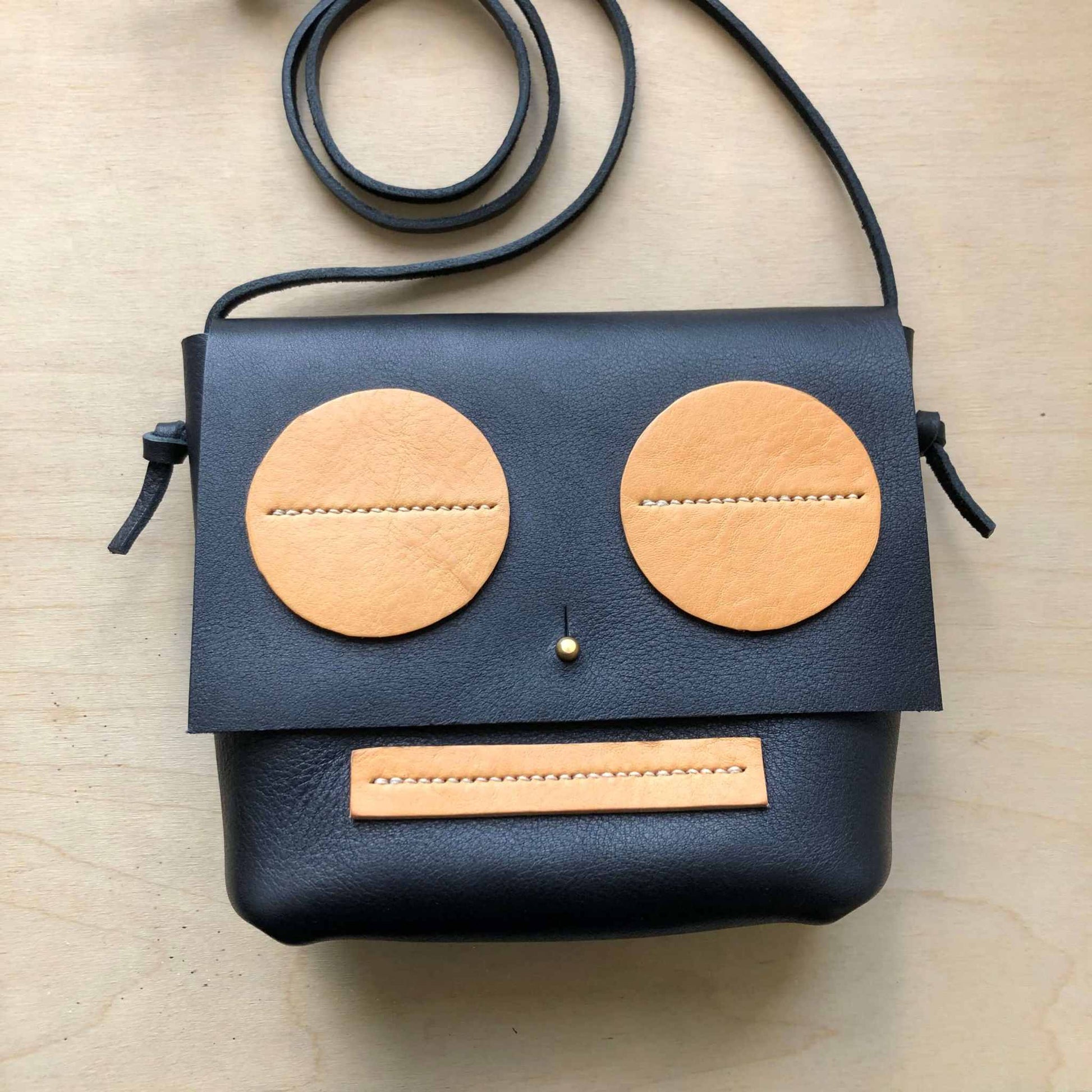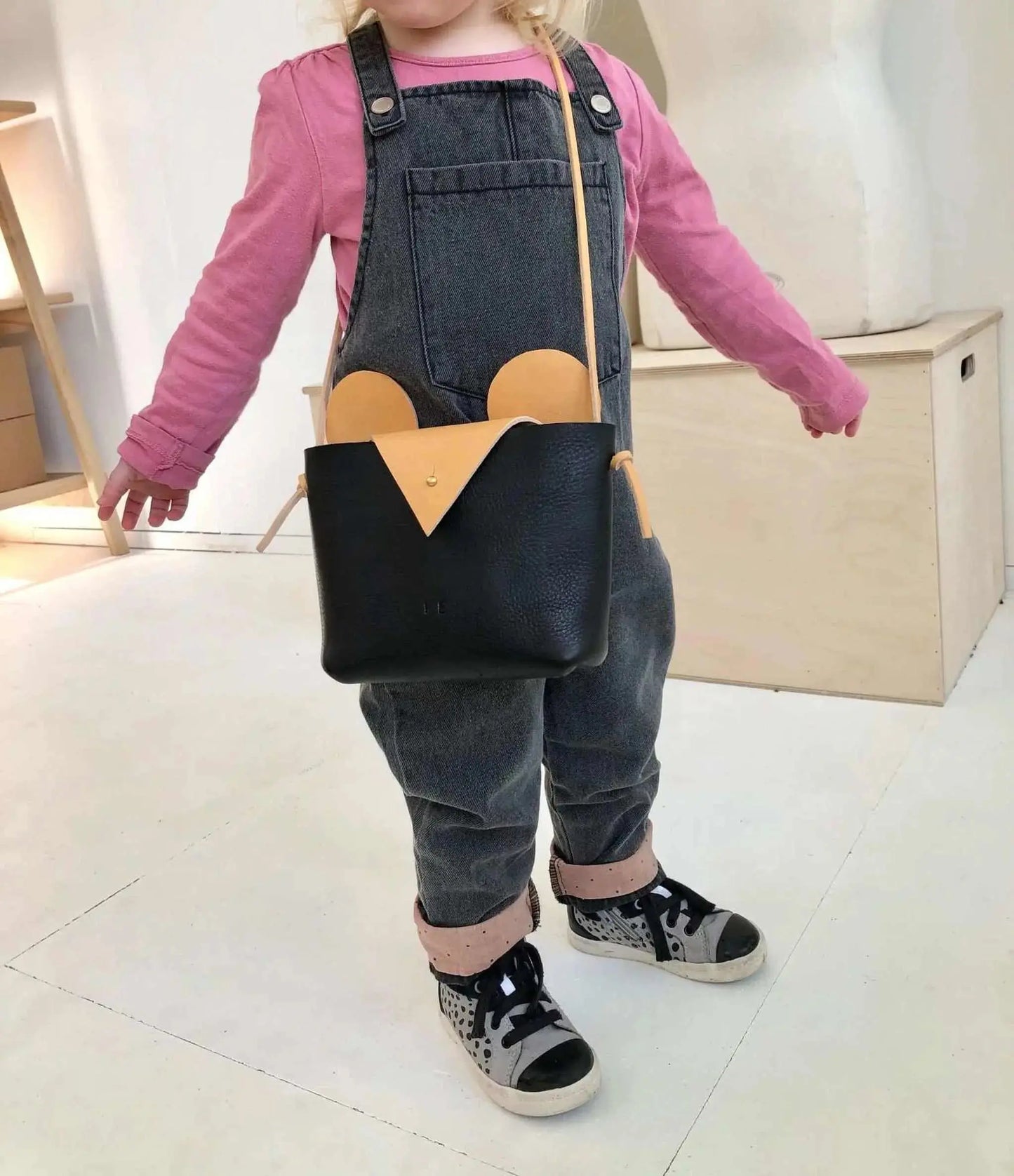Leather kids bag crafted in the UK from black full grain leather with natural leather ears and nose.