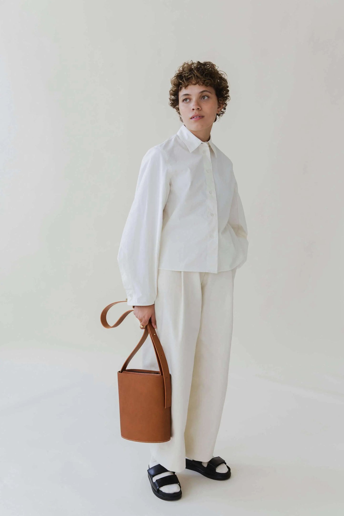 The leather bucket bag is a practical yet chic solution for work settings, accommodating your essentials while ensuring you make a refined impression.