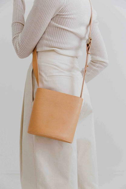 CARV custom service - Love this natural leather bucket bag but want it a little different (colour, fabric, size, strap length, pockets etc)? Just contact CARV and Becky will be happy to help design your perfect leather crossbody bag.