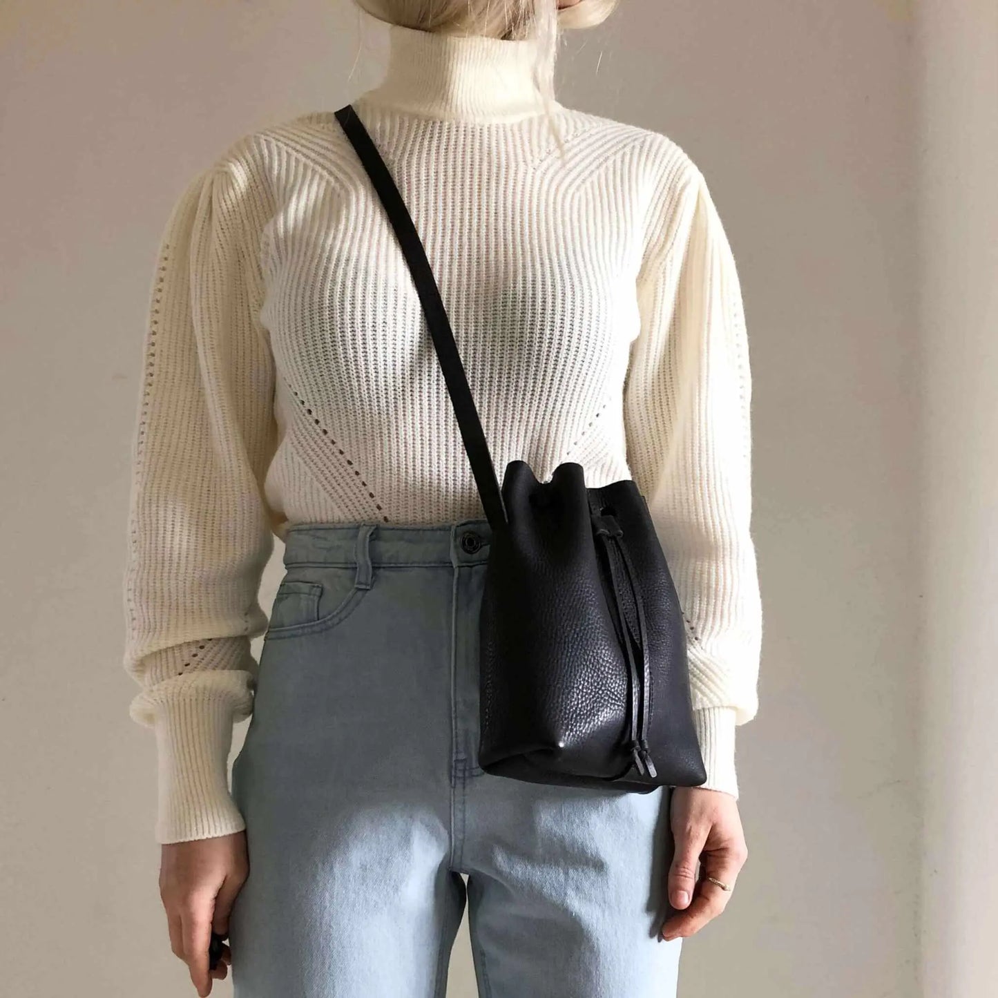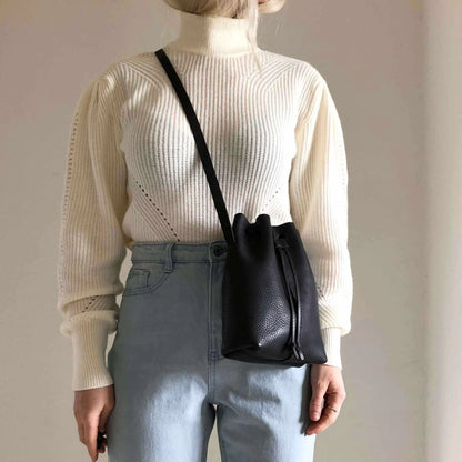 The leather bucket bag is a practical yet chic solution for work settings, accommodating your essentials while ensuring you make a refined impression.