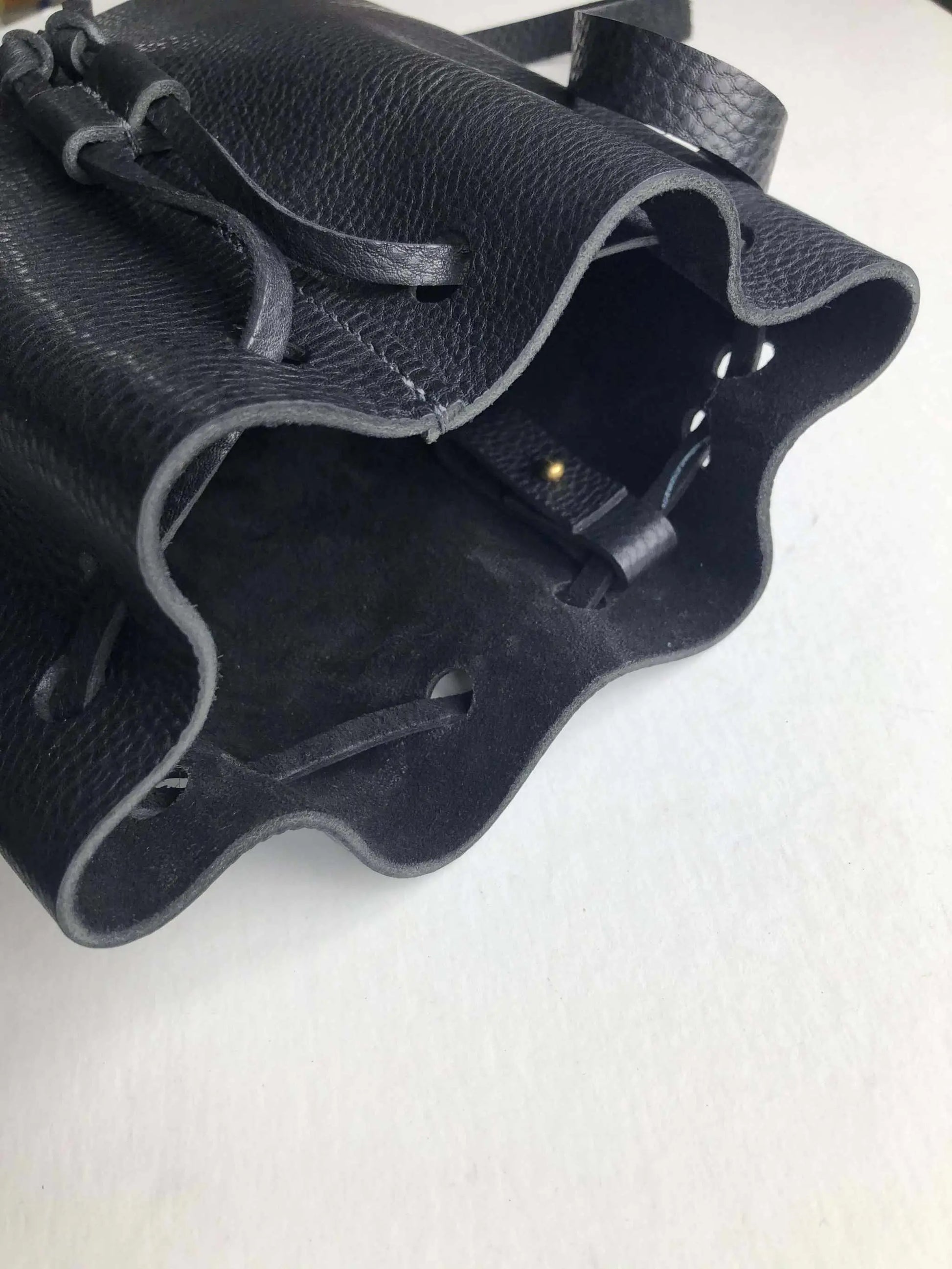 Leather bucket bag available in black or tan brown outer full grain leather.